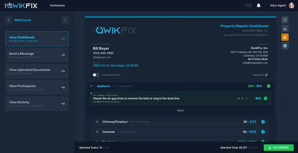 Once you receive the repair quote, you can add repairs to your cart and with the click of a button approve the work orders to be sent to an approved contractor network. Repairs are scheduled at your convenience: select your repair date(s) and The QwikFix generates work orders and convenient contractor scheduling dates. Flexible payment options are available, including credit card, check, or pay at closing.